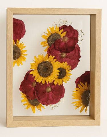 After we receive your bouquet, we begin the preservation process. Each flower is carefully pressed and dried over several weeks. Once fully dried, we’ll move into the design phase, where your custom frame layout begins to take shape based on your chosen style and frame.